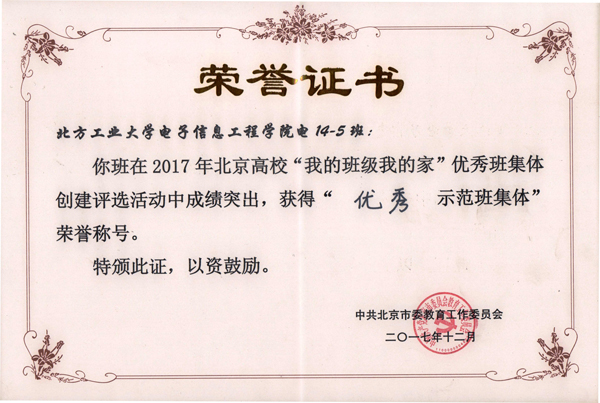 近日,2017年北京高校“我的班级我的家”优秀班集体创建评选活动在北京工业大学举行,贝博官网电信学院电14-5班在全市百余个参赛班集体中脱颖而出,荣获2017年北京高校“优秀示范班集体”荣誉称号。十年寒窗苦争渡,群英荟萃晋元路跨别高中,挥别父母,35名同学集合在北京美丽的西山脚下,这里钟灵毓秀,风光怡然。日月交替,夏秋轮回,这里是梦开始的地方。ballBET贝博BB艾弗森电子信息工程学院电14-5班组建于2014年9月,共有35人,其中党...
