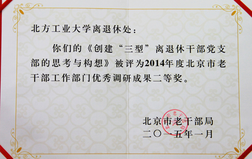近日,从北京市老干部局获悉,贝博官网离退休工作处撰写的调研报告《创建“三型”离退休干部党支部的思考与启示》荣获2014年度全市老干部工作部门优秀调研报告二等奖。