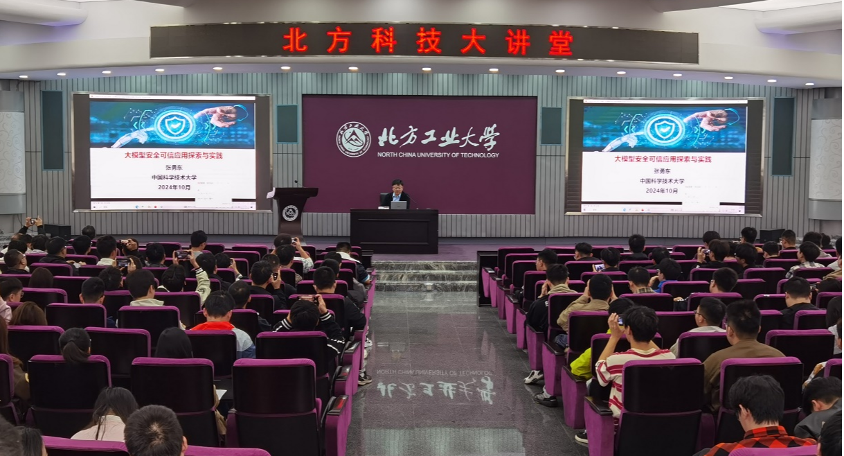 10月14日,中国科学技术大学教授、信息科学技术学院执行院长、国家杰出青年科学基金获得者、国家自然基金委创新研究群体项目负责人张勇东作为报告人,为贝博官网带来了题为“大模型安全可信应用探索与实践”的精彩报告。全校三百余名师生齐聚一堂,共同聆听这场学术大餐。报告会由信息学院院长马礼教授主持。会前,党委副书记、校长张立峰与张勇东教授进行了亲切交流,并为其颁发了北方科技大讲堂纪念铭牌。报告会上,张勇东教授从...