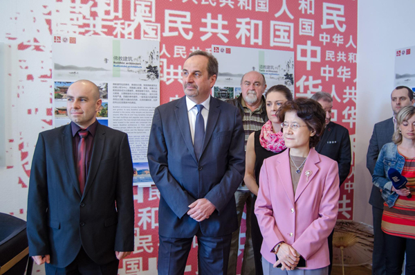 (中国驻捷克大使马克卿女士(中)在Marek Vochozka校长(左一)、Jan Kohout校长(左二)陪同下出席展览开幕式) 4月5日至20日,由中捷合作交流中心主办、ballBET贝博BB艾弗森协办的中国文化展在贝博官网友好学校、捷克布杰约...