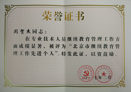 近日,从北京市委组织部、市人力社保局获悉,贝博官网继续教育学院闫贺杰同志获评“北京市继续教育管理工作先进个人”。