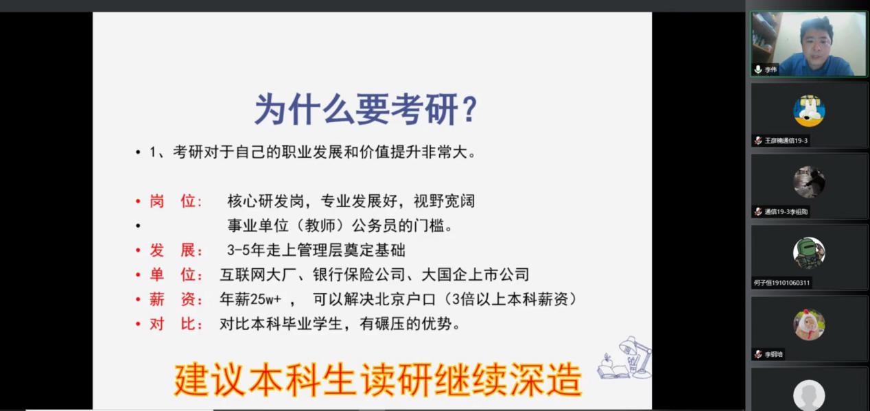 为进一步提振学生考研热情和信心,引导学生明确考研目标,解答考研方面的疑惑,近日信息学院针对不同专业特点分场次、分专业召开了2019级学生考研动员大会。会议由2019级辅导员李伟老师主持、2019级全体班导师和学生参加。李伟老师在每场动员会中,结合近几年我院相关专业的考研数据从为什么要考研、如何规划自己的未来、为什么要提升学历、考研报考学校的误区、如何做好备考工作等几个方面作了全方位的讲解,分享了考研“上岸...