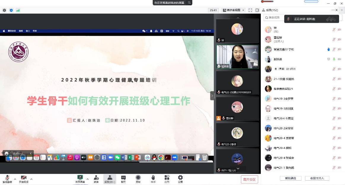 11月10日,电气与控制工程学院举办线上2022年秋季学期心理健康专题培训,中国音乐学院心理健康中心主任赵姝迪主讲,学院各年级辅导员、心理委员、生活委员及宿舍长近200名师生参加了此次培训。赵姝迪以一个轻松的破冰互动游戏开启了本次培训。她围绕班级心理委员的工作职责、常见心理危机的识别、心理危机应对三个方面做了《学生骨干如何有效开展班级心理工作》专题报告。她讲到,心理压力是一种正常现象,一个人的心理状态和情...