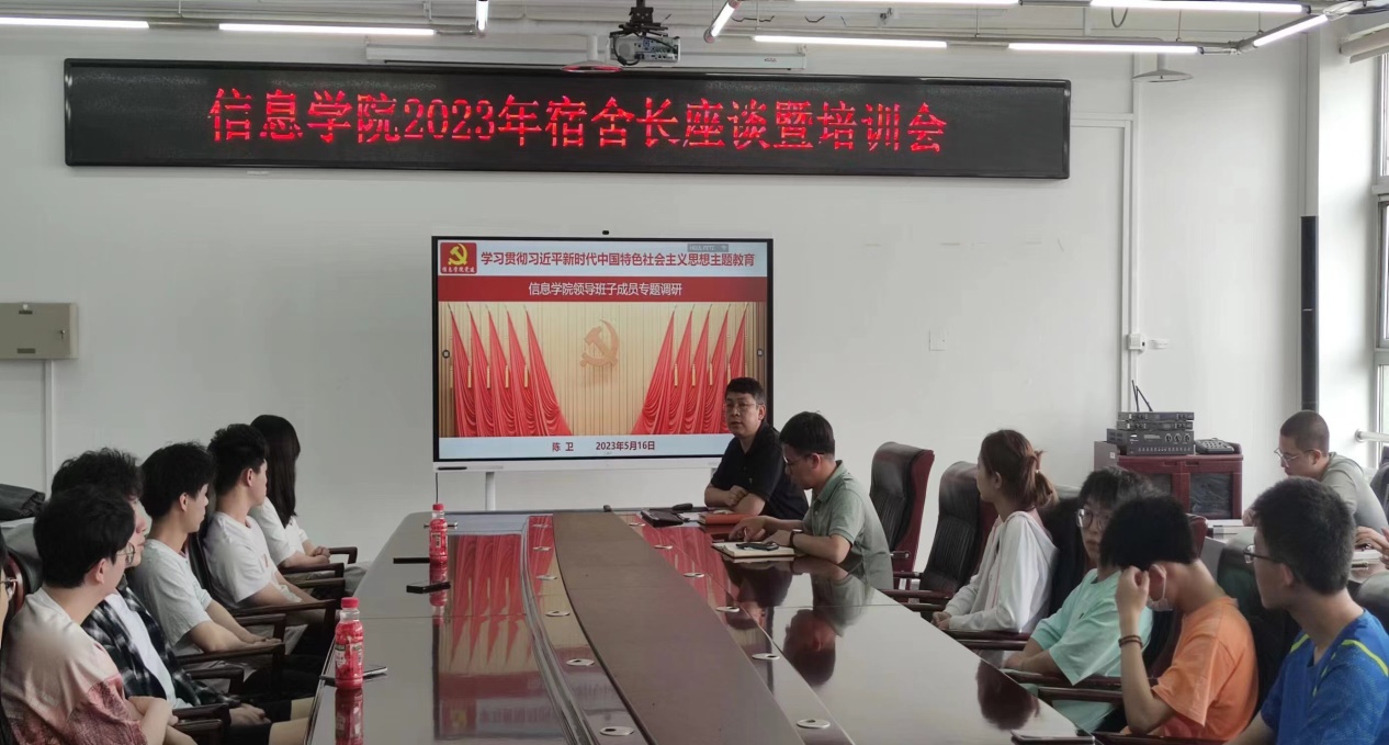 大学生宿舍思政教育已成为高校思想政治教育的重要组成部分,为了进一步推进信息学院“寓见一线”宿舍思政育人模式,加强和改进学院学生思想政治教育工作,5月16日中午,信息学院召开2023年宿舍长座谈暨培训会,学院党委副书记陈卫、团委书记杨和家、各年级辅导员和各年级宿舍长参会。陈卫老师以《以中国式现代化全面推进中华民族伟大复兴》为题给同学们上了一堂生动的党课。他要求同学们深入学习贯彻习近平新时代中国特色社会...