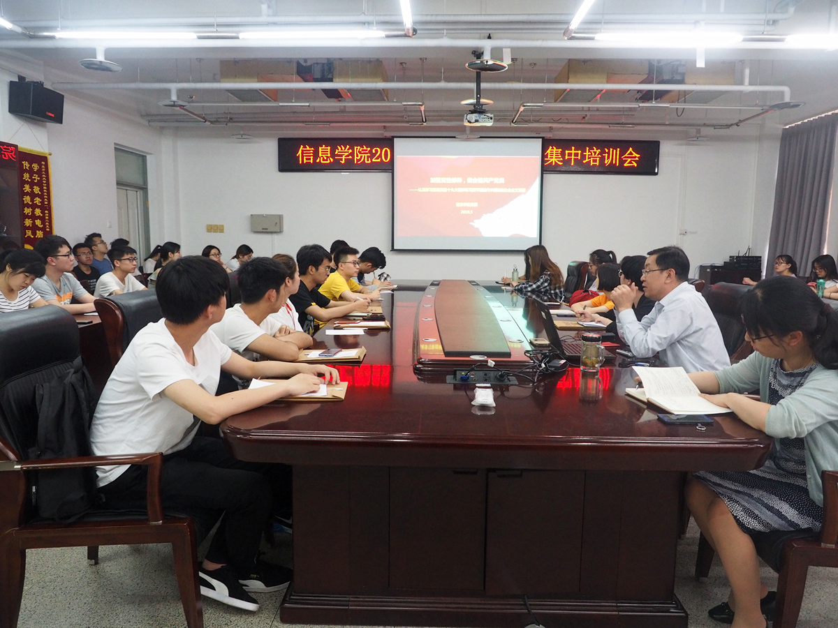 为进一步规范组织发展程序,提高发展党员的质量,近期信息学院党委对2019年春季发展对象进行了集中培训,培训分为集体理论学习、各支部组织学习研讨、党员自学、知识小测等环节。5月16日晚,学院党委书记刘文楷以“加强党性修养,做合格共产党员”为主题为发展对象上专题党课,党课由学院党委委员、团委书记刘霁炜主持。刘文楷同志分别从“八个新”--新主题、新思想、新成就、新时代、新矛盾、新目标、新任务、新要求几个方面同...