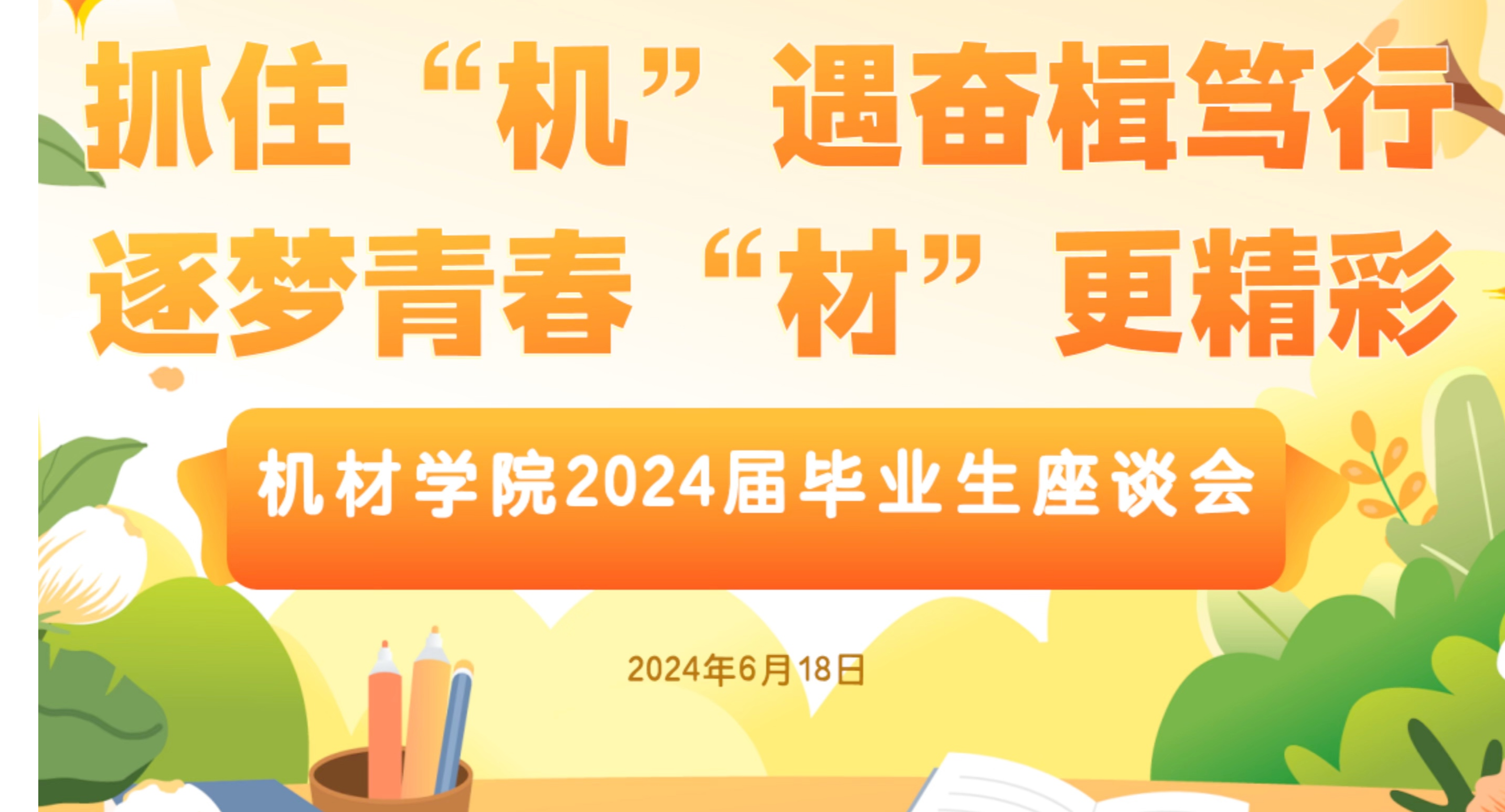 6月18日上午,机材学院2024届毕业生座谈会在博才楼202会议室举行。学院党委书记王文革、党委副书记石卉与学院40余位毕业生亲切交流,共同回顾成长历程、畅谈未来愿景、送上毕业祝福。座谈会上,毕业生代分别从学业、科研、就业等方面分享了自己的经历,回顾了在工大生活的所思所感,表达了面临毕业季对老师的不舍,并对学院多年来的悉心培养表示衷心感谢。石卉代表学院与参会毕业生进行了深入交流,并就他们学业、就业等困惑提...
