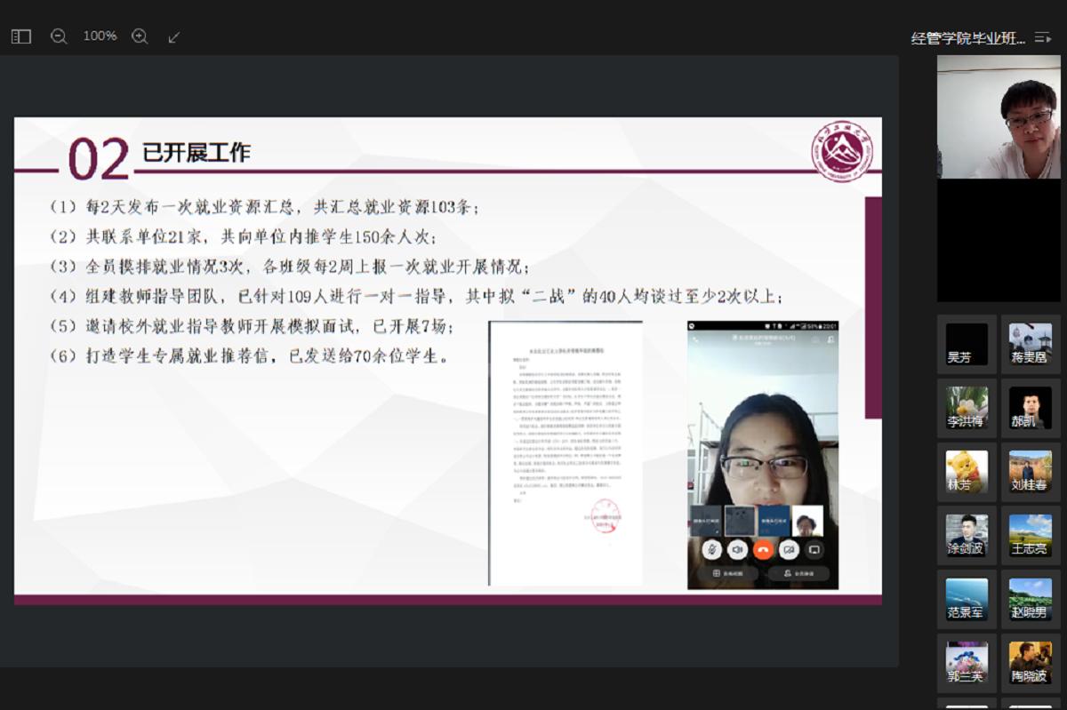 4月30日,经济管理学院召开线上毕业班就业工作推进会,对进一步推进毕业班就业工作进行部署。学院领导班子成员、各系主任、班导师、辅导员参加了此次视频会议。会上,副院长陶晓波针对毕业班学生的课程修读、论文撰写、毕业答辩等工作进行了安排,要求各班导师关注到班上每位学生,尤其是关注学分欠缺较多的学生,及时做好学业上的帮扶。副书记赵洁传达了上级关于就业工作的精神和要求,分析了当前就业工作中面临的问题,通报了...