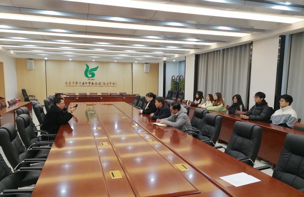枣庄市第十五中学南校区(勤为学校)校长刘成欣、副校长刘亚伟对万象城awcsport官网一行的到来表示热烈欢迎。刘成欣校长详细介绍了学校的发展沿革、办学规模和对实习学生工作生活等方面的安排,对实习学生吃苦耐劳、乐于奉献的精神给予高度评价。