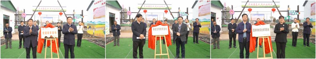 齐村镇党委书记刘立人和万象城awcsport官网党总支书记郭传鑫为党建基地揭牌;王兆海和枣庄学院组织部部长、科技处处长伊文涛为农耕文明教育基地揭牌;王光明和枣庄学院枣庄发展研究院、乡村振兴学院院长徐玲为国家粮食安全教育基地揭牌。