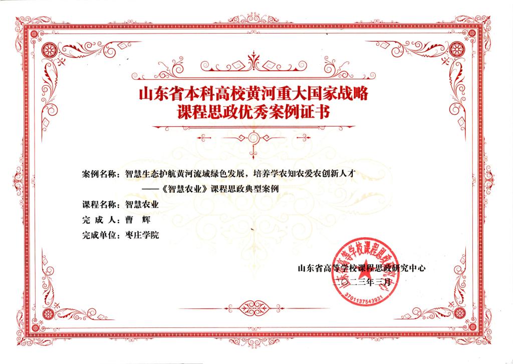 近日,山东省高等学校课程思政研究中心公布了“山东省本科高校黄河重大国家战略课程思政优秀案例”名单,植物科学与技术专业曹辉副教授依托《智慧农业》课程申报的教学案例《智慧生态护航黄河流域绿色发展,培养学农知农爱农创新人才》成功入选,学院课程思政建设取得新突破。