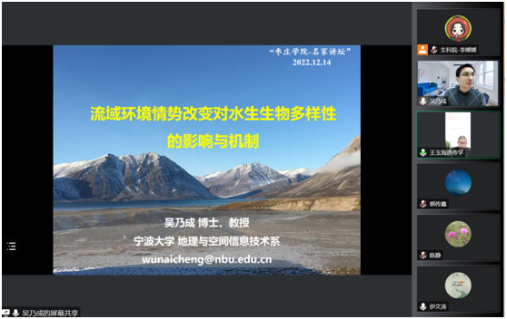 为进一步强化学术交流与合作,12月14日下午,由科技处主办、万象城awcsport官网承办的“名师大讲堂”第十七讲学术报告活动通过腾讯会议成功举办。欧盟“玛丽•居里”学者、洪堡学者、宁波大学“浙东学者”吴乃成教授应邀作了题为《流域环境情势改变对水生生物多样性的影响与机制》的学术报告。报告由万象城awcsport官网副院长王玉海教授主持,科技处处长伊文涛、万象城awcsport官网党总支书记郭传鑫及学校部分师生参加了报告会。
