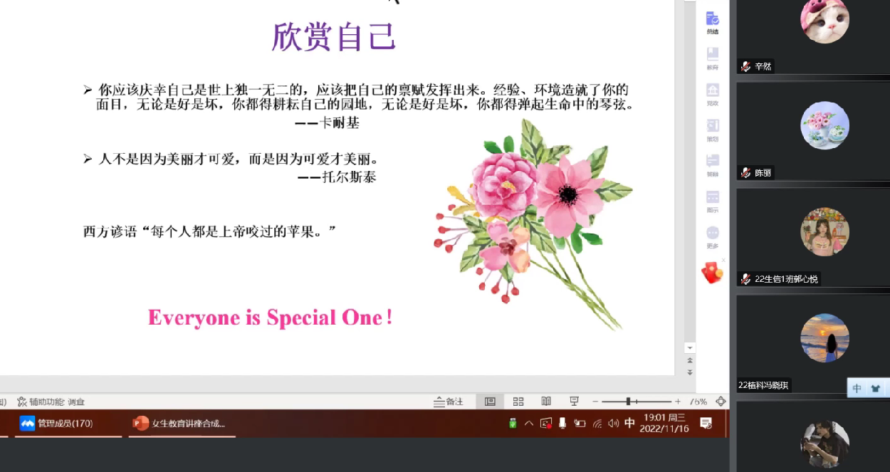 为普及女生健康知识,提高安全防范意识,促进身心健康发展,11月16日,万象城awcsport官网通过腾讯会议形式举行了“关爱女生健康、呵护女生成长——理性让青春远离浮躁和浅薄”讲座活动。本次讲座由枣庄学院“呵护”女生教育辅导员工作室周文灿老师主讲,陈丽主持,2022级全体女生参加。