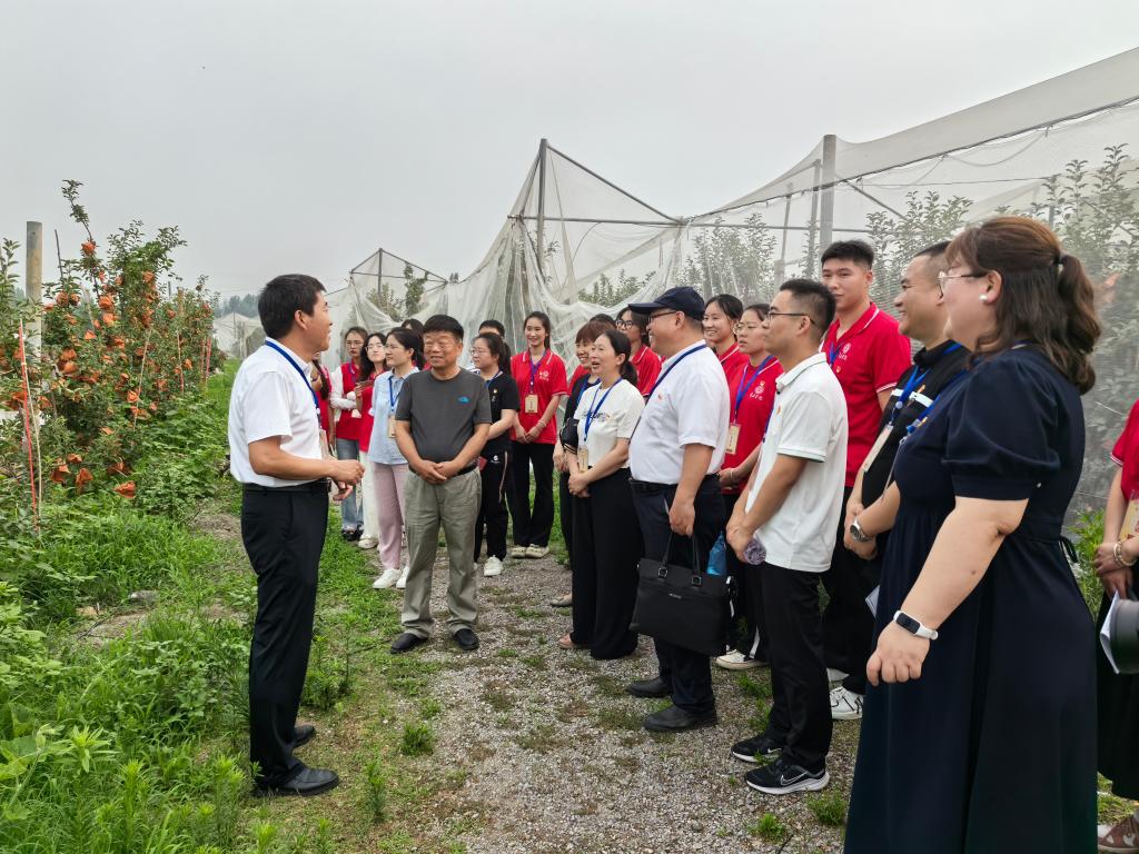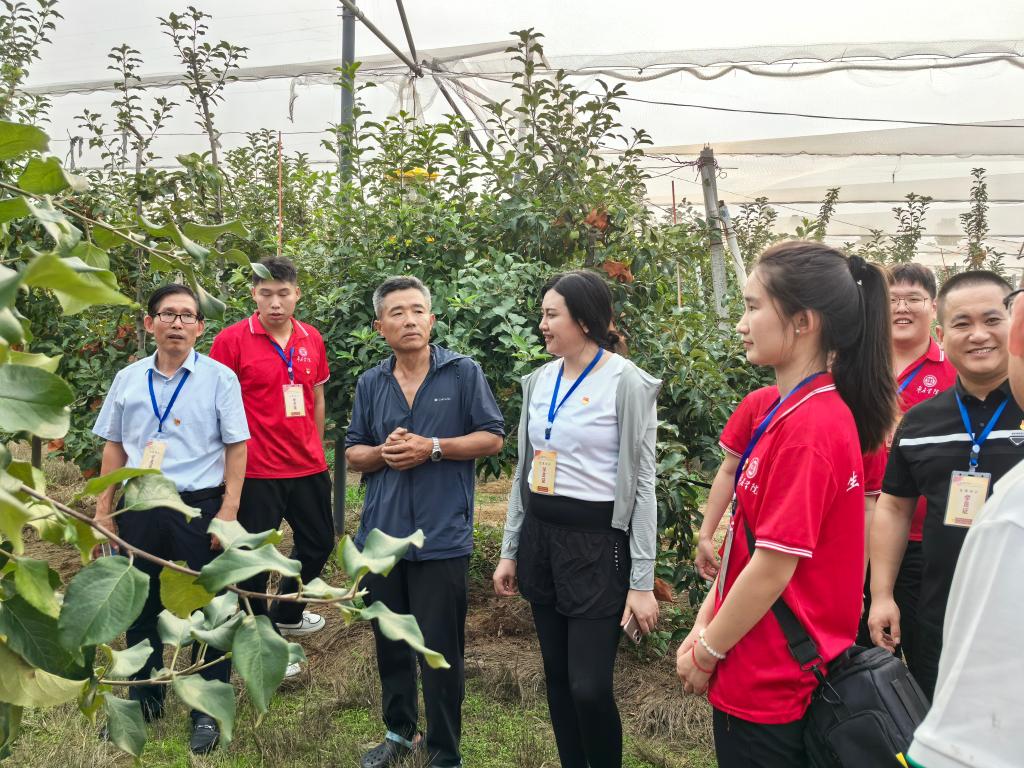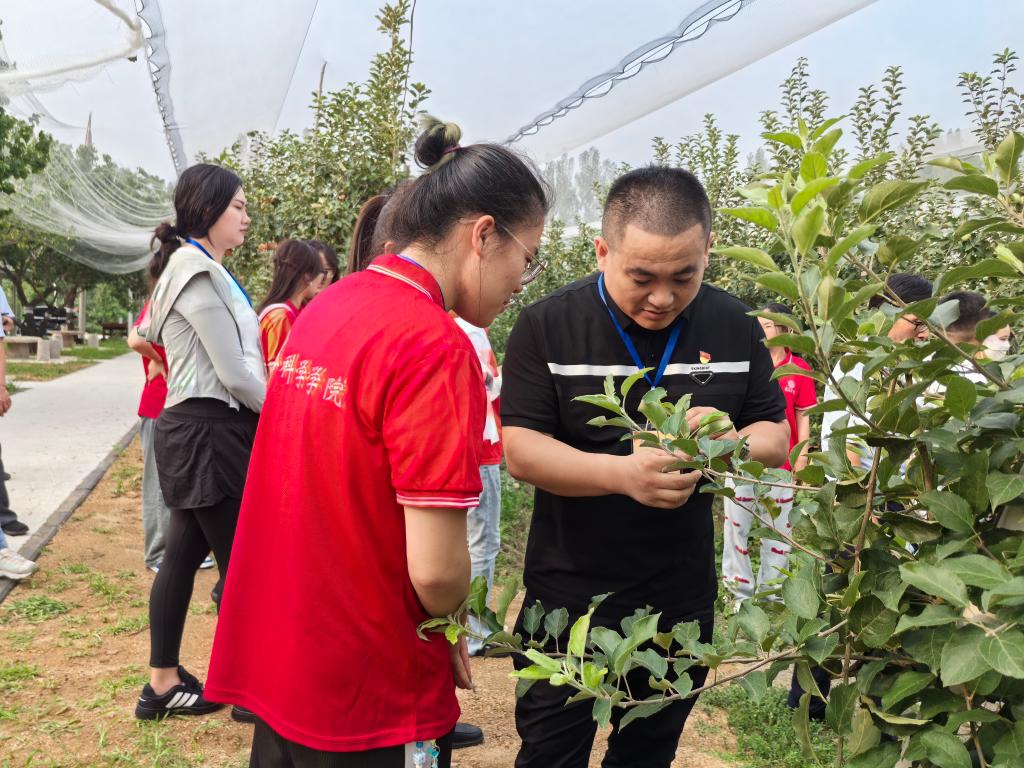 志愿者们在院党委书记郭传鑫、苹果科技小院负责人刘启振的带领下参观了苹果科技小院,了解了苹果科技小院的特色、苹果栽培方式以及使用的现代农业设施等,并就苹果种植过程中遇到的问题进行了交流探讨。对于提出的种植过程中出现的问题,志愿者师生们一一进行解答。