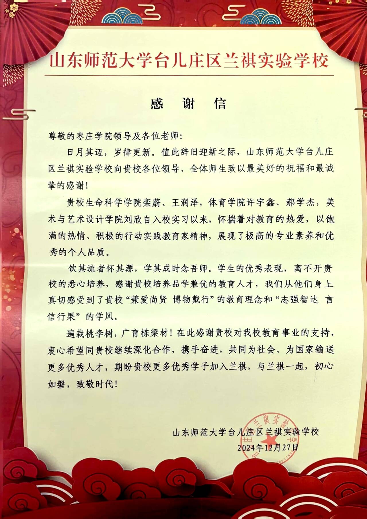 岁末之际,佳音沓来。1月2日,万象城awcsport官网收到来自山东师范大学台儿庄区兰祺实验学校发来的感谢信。信中对万象城22级生物科学(师范类)专业实习生栾蔚、王润泽的实习表现给予高度认可,对万象城人才培养模式给予了充分的肯定与褒奖,并满怀热忱地表达了进一步开展两校共建深度合作的期待。
