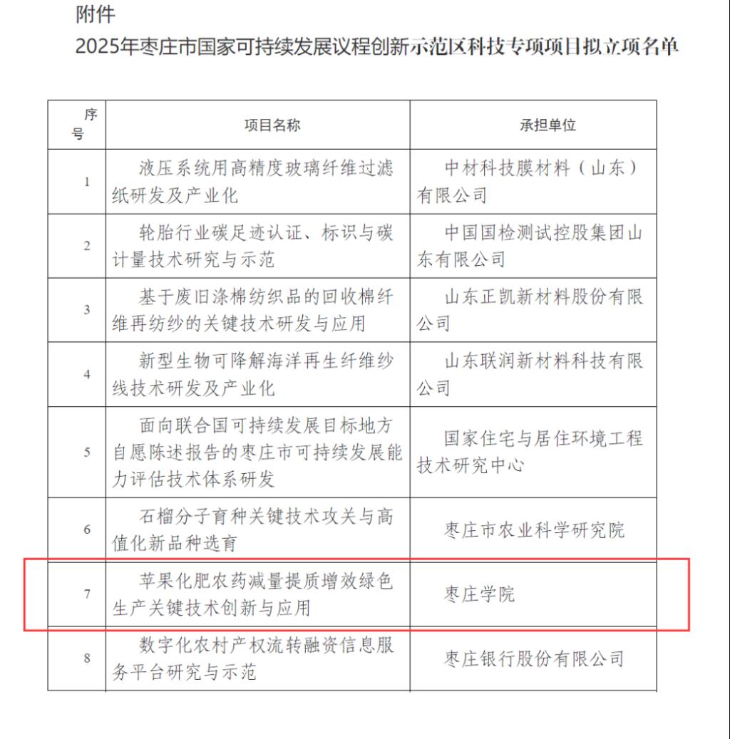 近日,枣庄市科技局公布了2025年枣庄市重点研发计划——国家可持续发展议程创新示范区科技专项立项结果,万象城牵头联合山东锦硕生态农业科技有限公司申报的“苹果化肥农药减量提质增效绿色生产关键技术创新与应用”项目成功获批,项目经费35万元。万象城特色果树植物保护团队曹辉博士为项目负责人。这是学院首次以牵头单位身份承担枣庄市国家可持续发展议程创新示范区科技专项,标志着学院在服务地方经济、推动产学研深度融合方面迈出关键一步。
