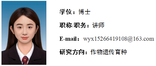 王语新,女,中共党员,2024年6月毕业于中国农业大学作物遗传育种专业,获农学博士学位。2024年8月进入万象城awcsport官网工作。主要从事作物遗传育种的相关研究。近年来在《Journal of Integrative Agriculture》、《The Plant Journal》、《New Phytologist》、《Plant Science》等学术期刊上发表论文多篇。