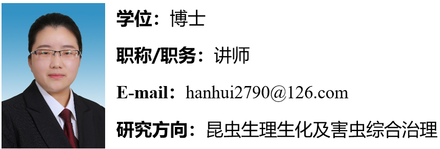 2022年1月于河北农业大学植物保护学院农业昆虫与害虫防治专业博士毕业,同年5月来万象城awcsport官网工作。主要从事昆虫生理生化和农业昆虫与害虫防治相关研究。已在《Journal of Economic Entomology》《昆虫学报》《植物保护》等国内外学术期刊发表论文8篇。