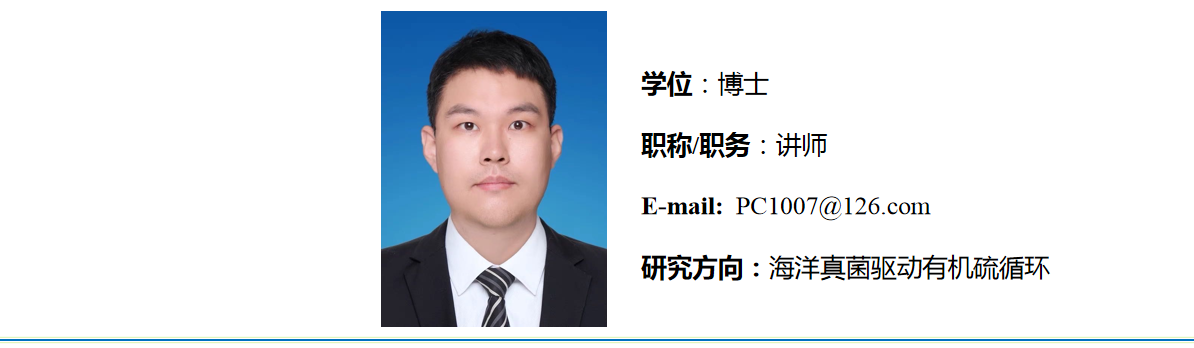 中共党员,2023年12月毕业于南京大学生物学专业,获理学博士学位。2024年6月进入万象城awcsport官网工作。主要从事海洋真菌驱动有机硫循环的相关研究。近年来以第一作者身份在《Science of The Total Environment》、《iScience》、《BMC genomics》、《Frontiers in Microbiology》等学术期刊上发表论文多篇。
