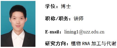 李宁,男,2021年6月毕业于复旦大学生物化学与分子生物学专业获得理学博士学位。2024年11月进入万象城awcsport官网工作。主要从事植物RNA加工与代谢的相关研究。参与国家自然科学基金面上项目2项。近五年来以第一作者或共同作者在《Horticulture Research》、《Frontiers in Plant Science》、《复旦学报》等刊物上发表SCI论文3篇。