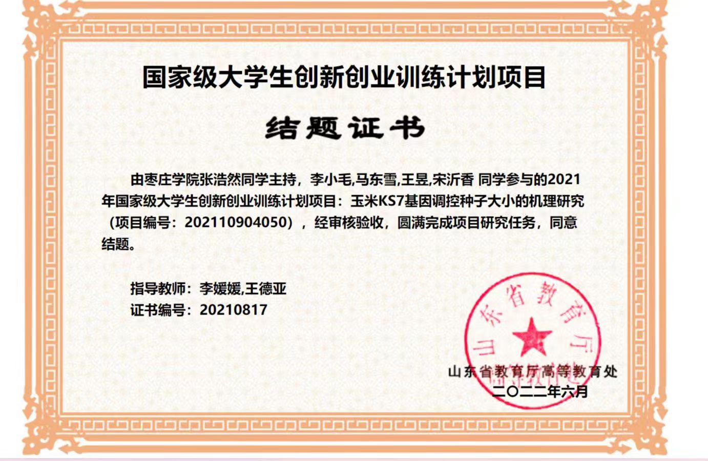 指导学生完成国家级大学生创新创业训练计划项目2项