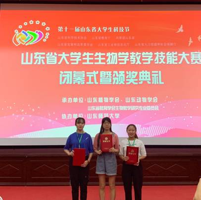 8月31—9月1日,山东省大学生生物学教学技能大赛在山东师范大学举行。作为第十一届山东省大学生科技节的赛事活动之一,共有来自省内22所学校的212名本科生、硕士研究生选手参加了本届大赛。决赛由教学设计、说课、模拟授课、现场答辩4个环节组成,经过激烈比拼,生科院选派的3位学生均取得优异成绩,其中2016级生物科学专业刘艳丽同学获得一等奖,于湘钒、殷艳平同学获得二等奖。陈青、刘晓松、贺诗水、王红妹、谭小艳老师获得优秀指导教师。