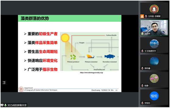 在报告中,吴乃成教授首先从“人类活动和流域生态健康、流域评价体系的建立、流域水文过程和生物多样性、生物多样性内涵和维持机制”四个方面介绍了研究背景。随后,基于两个研究案例,吴教授详细阐述了河流水文情势变化对底栖硅藻生物多样性和生态系统功能的影响和机制,指出相关技术成果对深入开展水利工程对生物多样性的影响及生态修复具有极高的应用价值。报告最后,吴教授与参会师生进行了深入交流探讨。