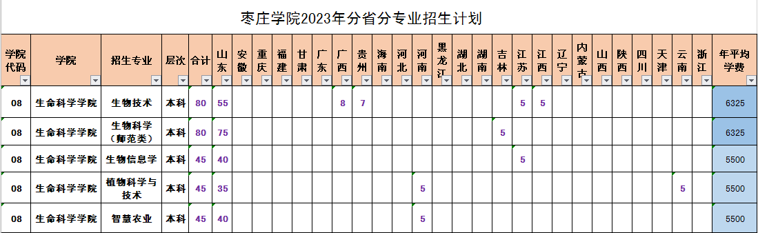 枣庄学院2023年分省分专业招生计划