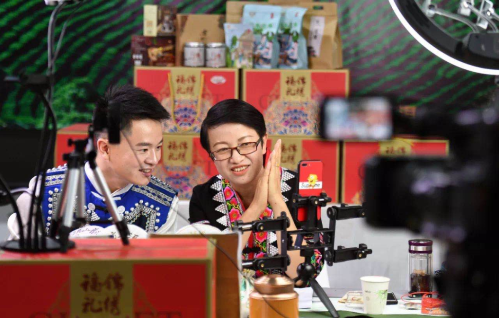 4月6日,云南省宁洱哈尼族彝族自治县副县长孙颖洁(右)通过网络直播推介当地土特产。