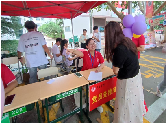 19日上午,党员志愿者们早早在迎新点集结,身着统一服装,佩戴党徽,精神饱满地迎接新生的到来。从新生踏入校门的那一刻起,学生党员们主动上前,热情接待每一位新同学。他们不仅帮忙搬运行李,还与新生亲切交谈,了解他们的专业、家乡等情况,真诚的关怀让新生倍感温暖与亲切。在引导新生前往宿舍的途中,学生党员化身为“校园导游”,向新生们详细介绍教学楼、图书馆、食堂等重要设施的具体位置,并分享自己的学习与生活经验,帮助新生尽快适应大学生活。这一系列细致入微的服务,让新生们对学校有了更加深入的了解,消除了初到校园的陌生感。