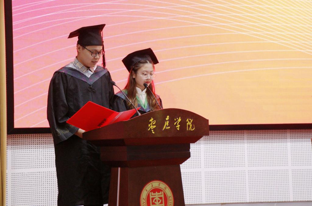 毕业生代表徐东方、韩珂用诗歌朗诵的方式叙述了在枣院的学习和成长历程,表达了对母校的眷恋不舍和对未来的无限憧憬。