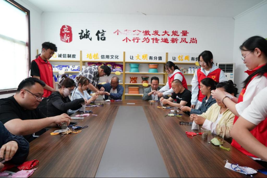 此外,志愿者们利用布料、艾草、薰衣草等天然材料,耐心地讲解香包的制作步骤,从布料剪裁到填充香料,再到最后的缝合装饰,居民们兴致勃勃地动手制作。这些散发着自然清香的香包不仅能驱虫避秽,更承载着美好的传统文化寓意。