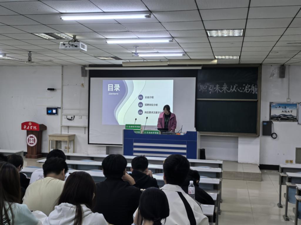 本次活动的创新之处在于,学生们从“求职者”转变为“招聘者”。他们模拟不同领域的生物科技或医药企业代表向台下的“应聘者”详细介绍公司背景、发展战略、招聘计划以及具体的岗位要求。这一角色转换极大地考验了同学们对行业认知、岗位分析和沟通表达的综合能力。现场气氛活跃,各“企业”宣讲精彩纷呈。