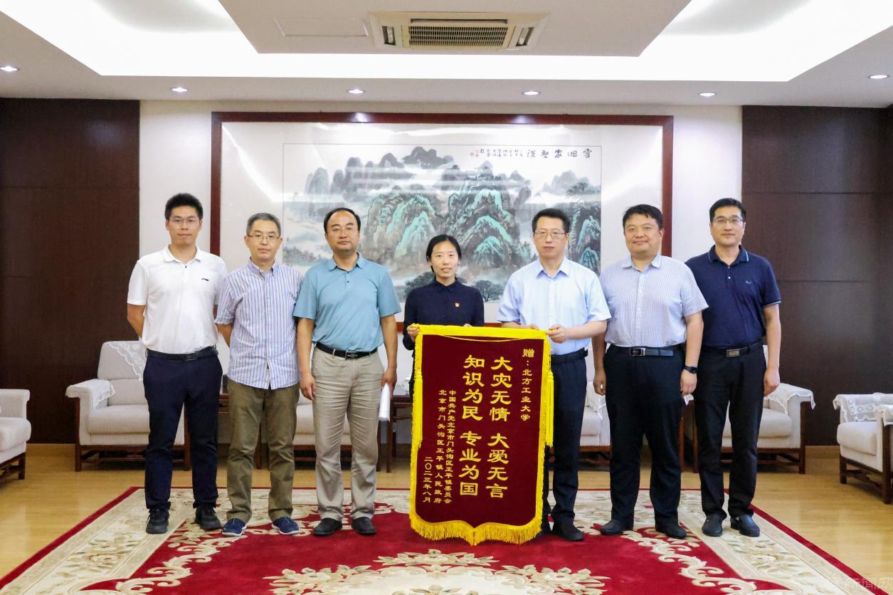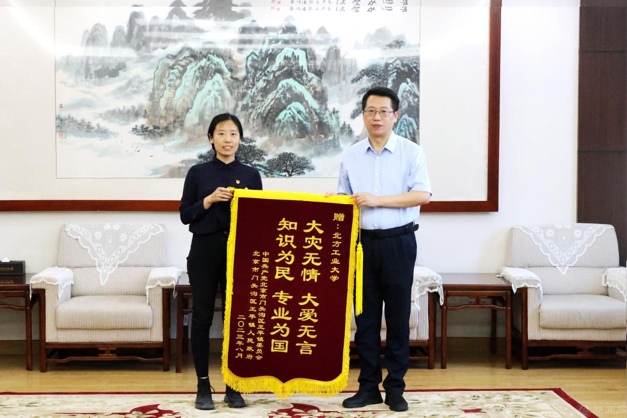 8月24日,门头沟区王平镇镇长沈若萌专程来校,对贝博官网科研团队和科技力量第一时间投入王平镇抗灾抢险和灾后重建工作表示感谢,并向学校赠送了锦旗和感谢信。校党委书记缪劲翔,党委常委、副校长王力,校长助理陈群会见了沈若萌一行。