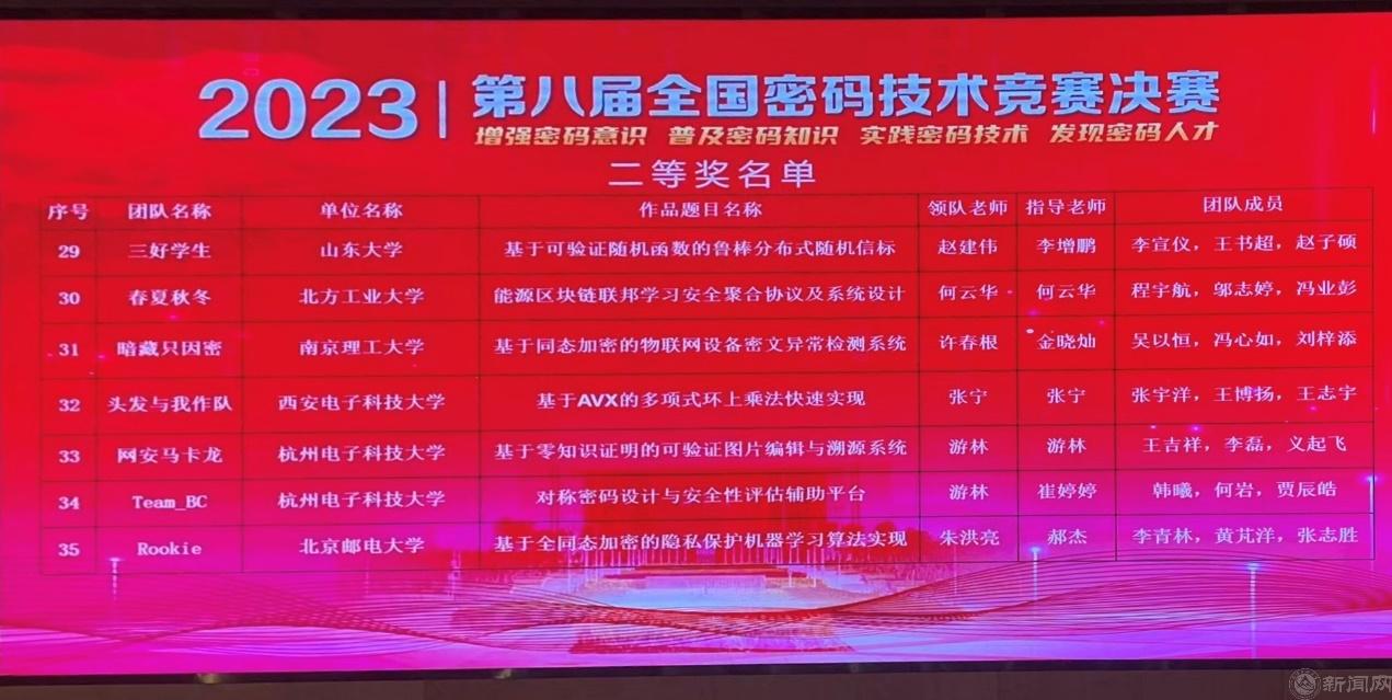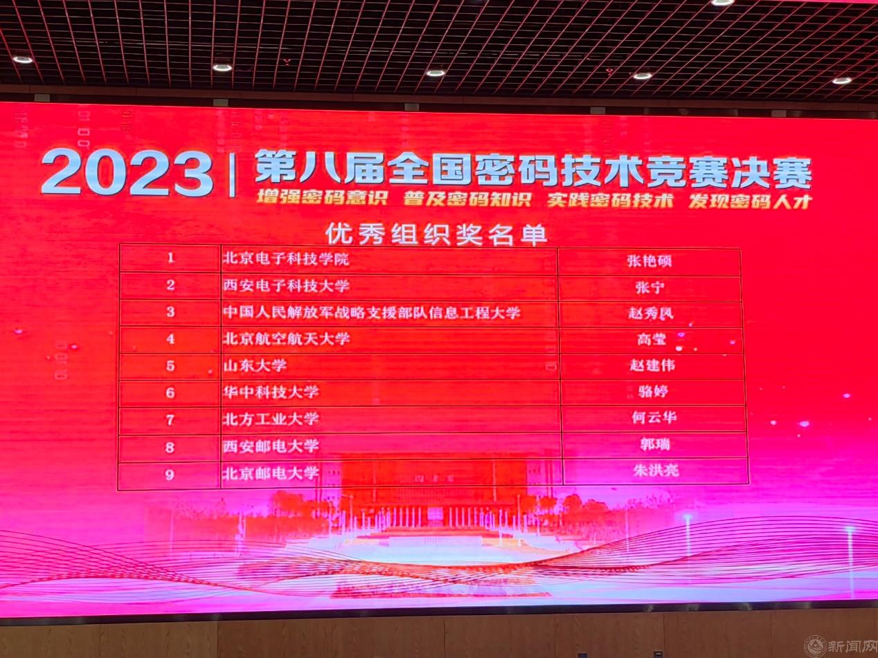 11月25日,由国家密码管理局指导、中国密码学会主办的“第八届全国密码技术竞赛”决赛在新疆大学信息科学与工程学院落下帷幕。贝博官网在比赛中获全国二等奖1项、三等奖5项,学校获得“优秀组织奖”,获奖情况在全国高校中位居前列。