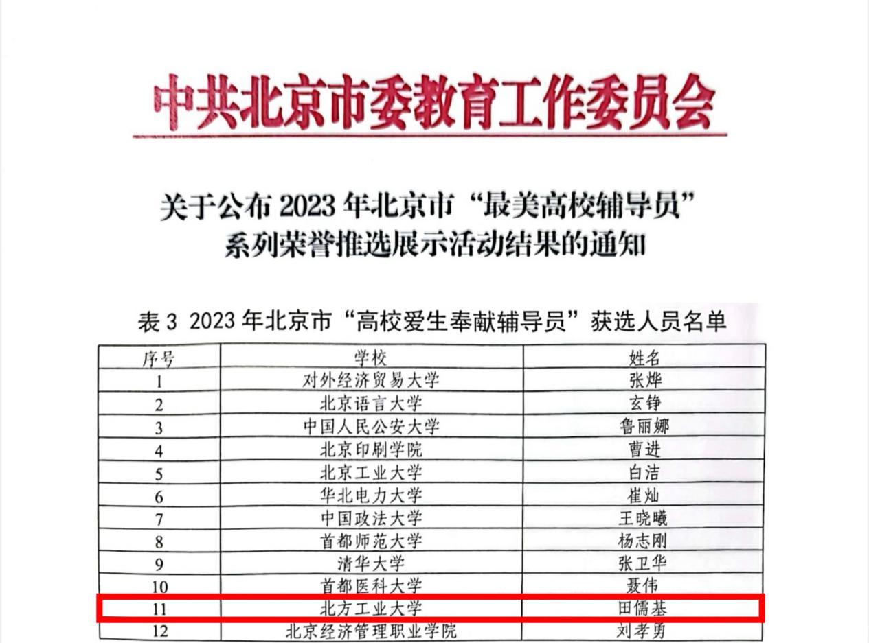 近日,北京市委教育工委公布北京市“最美高校辅导员”系列荣誉推选结果和“新时代北京高校思想政治工作创新示范项目”遴选名单。贝博官网电气与控制工程学院辅导员田儒基获评2023年北京市“高校爱生奉献辅导员”荣誉称号,“绣花”思政工作室入选“北京高校思政工作创新示范工作室”,《“纽扣课堂”打造宿舍思政育人新模式》《融合式心理干预助学生化“无望”为“希望”》案例入选“北京高校思政工作创新示范案例”。