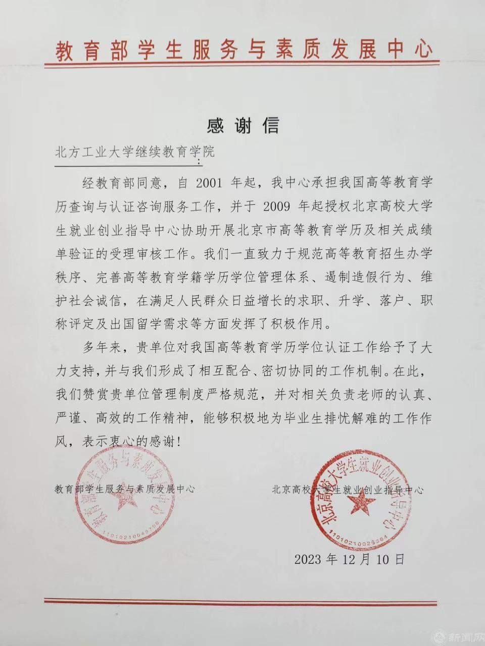 近日,贝博官网继续教育学院收到教育部学生服务与素质发展中心与北京高校大学生就业创业指导中心联合发来的感谢信。信中对贝博官网继续教育学院在学历学位认证方面的工作给予的充分肯定,对学院管理制度严格规范、负责老师认真严谨高效的工作精神、为毕业生排忧解难的工作作风表示衷心感谢。
