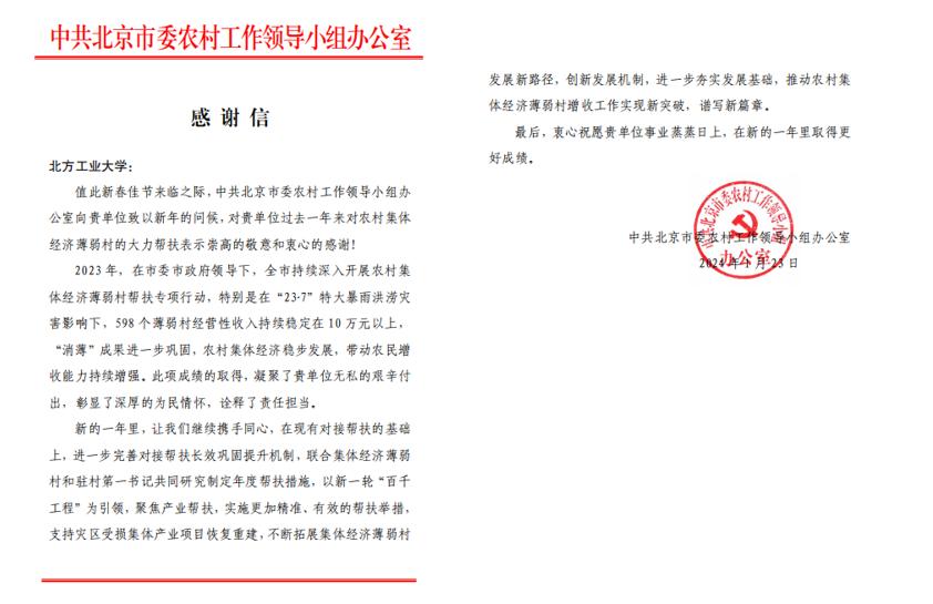 近日,中共北京市委农村工作领导小组办公室给贝博官网发来感谢信,感谢贝博官网在过去一年来对农村集体经济薄弱村的大力帮扶。