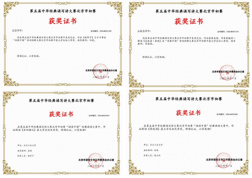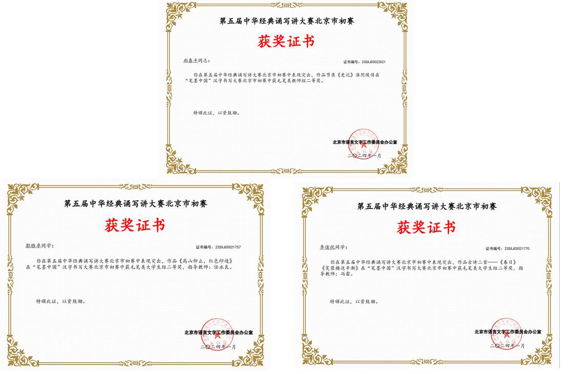 近日,北京市教育委员会、北京市语言文字工作委员会联合公布第五届“中华经典诵写讲大赛”北京赛区获奖名单,贝博官网在比赛中喜获佳绩。学校获评“笔墨中国”分赛优秀组织奖和“诵读中国”分赛优秀组织奖,师生共获得13个奖项,其中二等奖3项,三等奖6项,优秀奖4项。