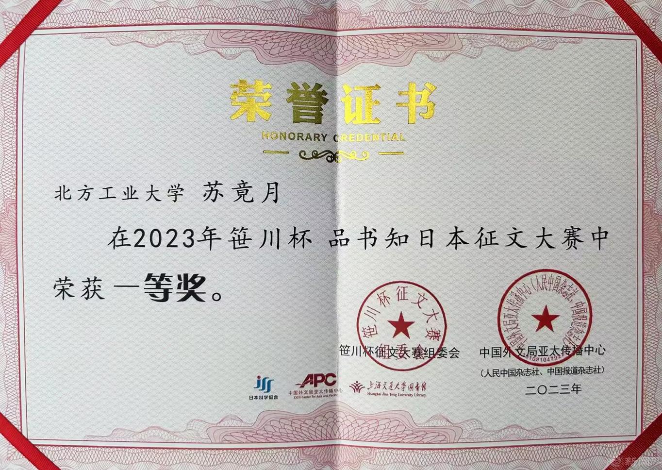 本次大赛共收到来自全国各地的参赛作品1900余篇,最终评选出一等奖4名,二等奖8名、三等奖30名、优秀奖40名、优秀指导教师奖35名。苏竟月同学是贝博官网日语系2023届本科毕业生,并于同年9月考入贝博官网外国语言文学硕士点日语语言文学专业,此次获奖体现了日语系及外国语言文学学科注重培养学生创意和写作能力、跨文化交际能力的实践教学成果。