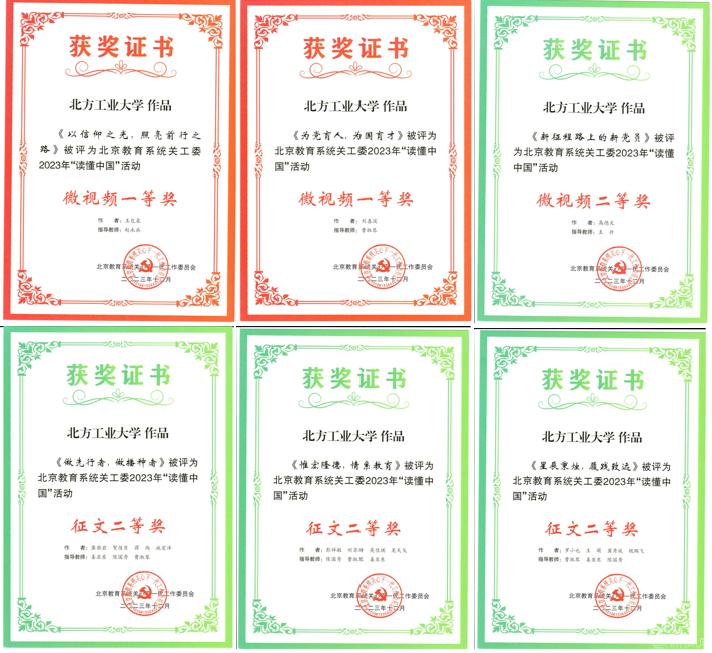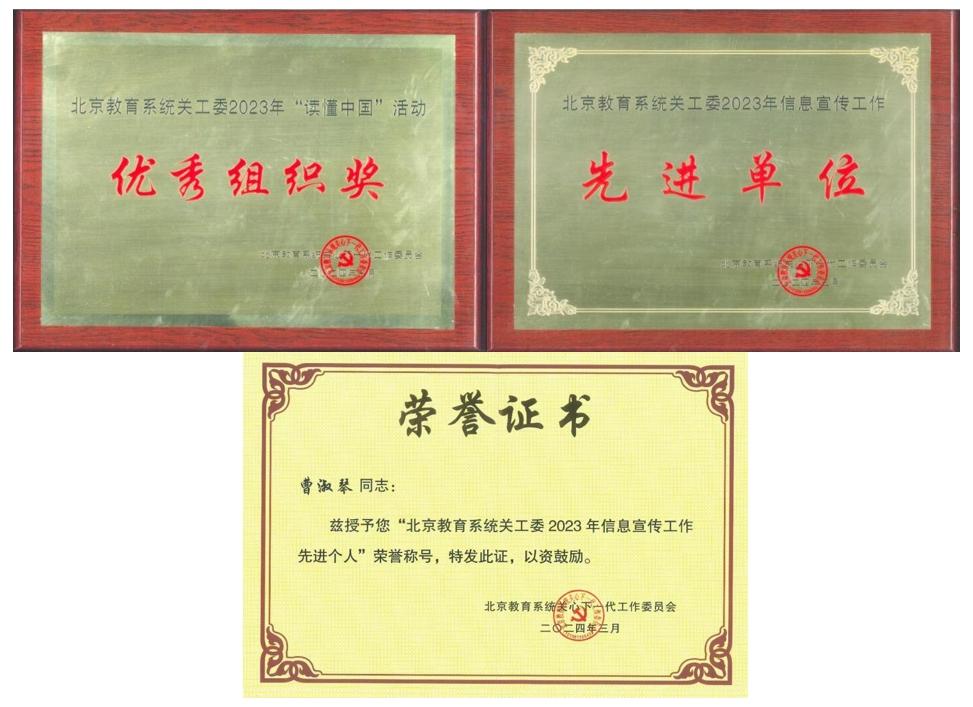 贝博官网关工委荣获“北京教育系统关工委2023年信息宣传工作先进单位”“北京教育系统关工委2023年‘读懂中国’活动优秀组织奖”“北京教育系统2023年军训服装捐赠工作先进单位”。校关工委副秘书长曹淑琴被评为“北京教育系统关工委信息宣传工作先进个人”。贝博官网“读懂中国”活动微视频作品荣获北京教育系统关工委一等奖2项、二等奖1项,征文荣获二等奖3篇。