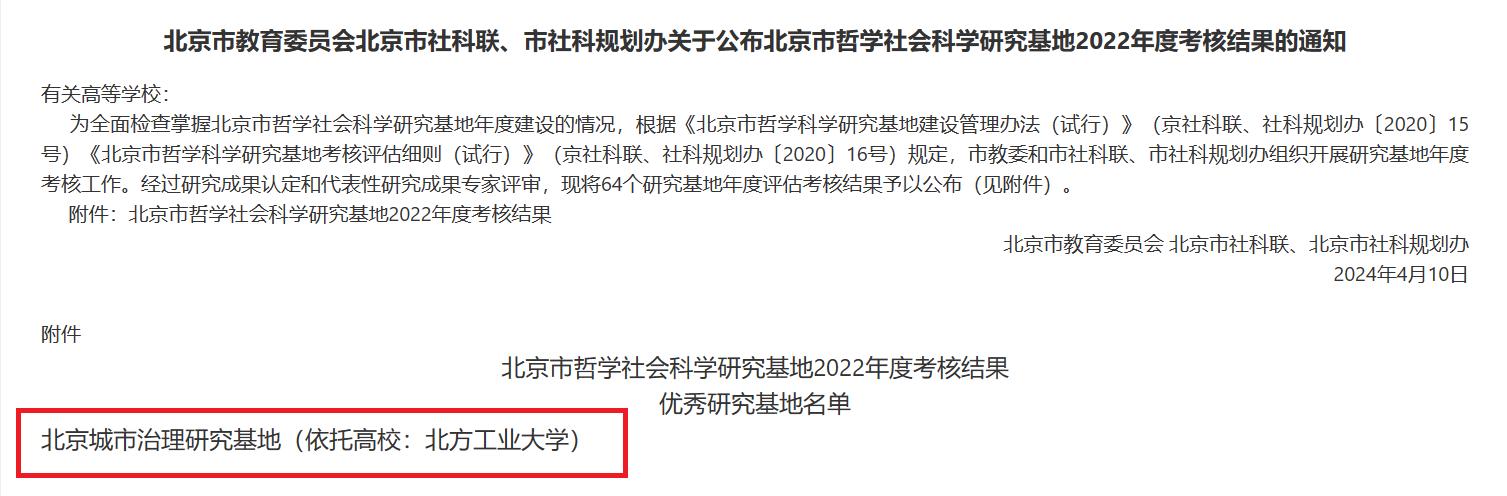 近日,市教委、市社科联和规划办公布了北京市哲学社会科学研究基地2022年度考核结果。经过研究成果认定和代表性研究成果专家评审,贝博官网北京城市治理研究基地在64个研究基地年度评估考核中脱颖而出,获评优秀。