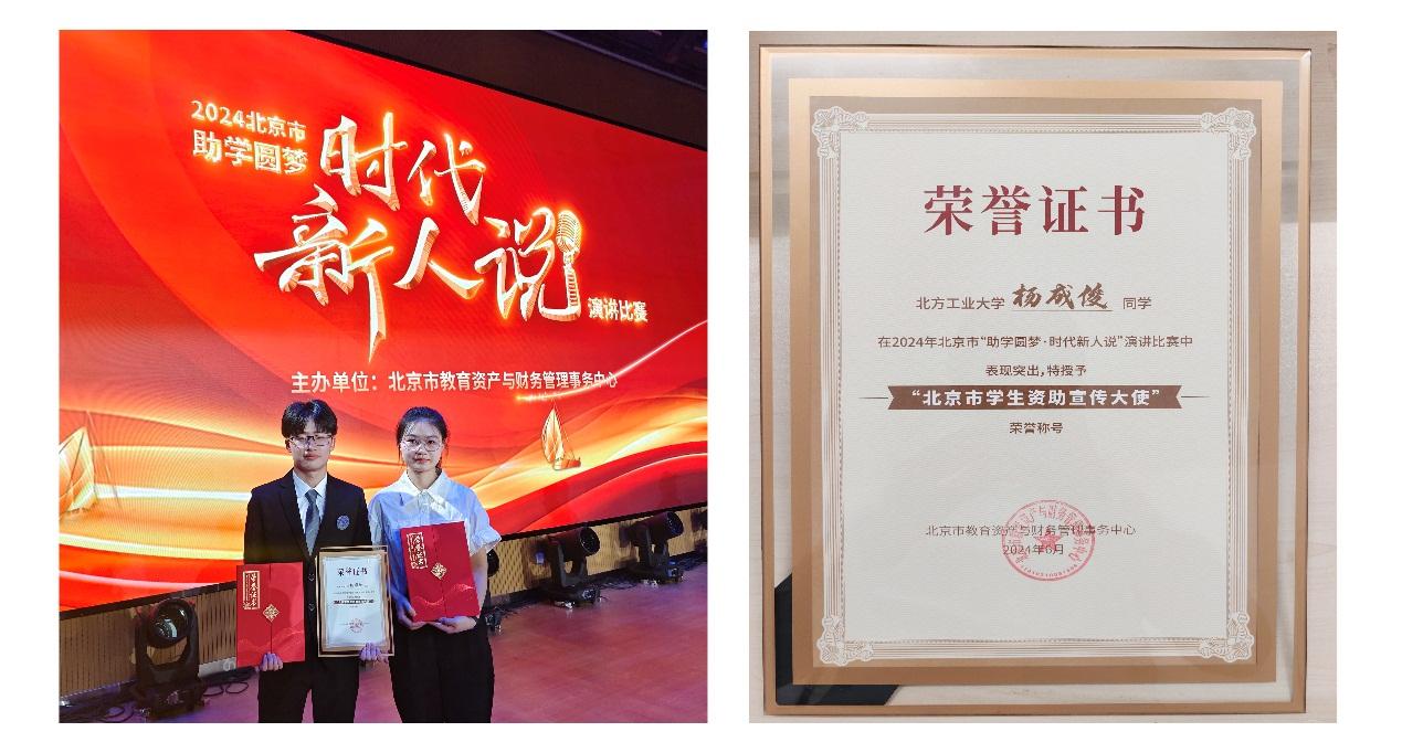 6月7日,在2024年北京市“助学圆梦·时代新人说”演讲比赛总决赛中,贝博官网电气与控制工程学院杨成俊同学表现优异,获评2024年北京市“学生资助宣传大使”。同时,杨成俊同学与建筑与艺术学院彭祥敏同学入选“北京市学生资助宣讲团”。