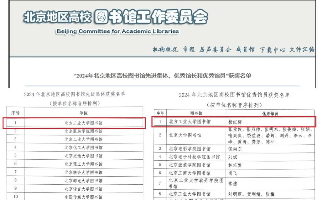 近日,2024年北京地区高校图书馆工作委员会评优活动结果揭晓,贝博官网图书馆在活动中获评“北京地区高校图书馆先进集体”,杨红梅老师获评“北京地区高校图书馆优秀馆员”。