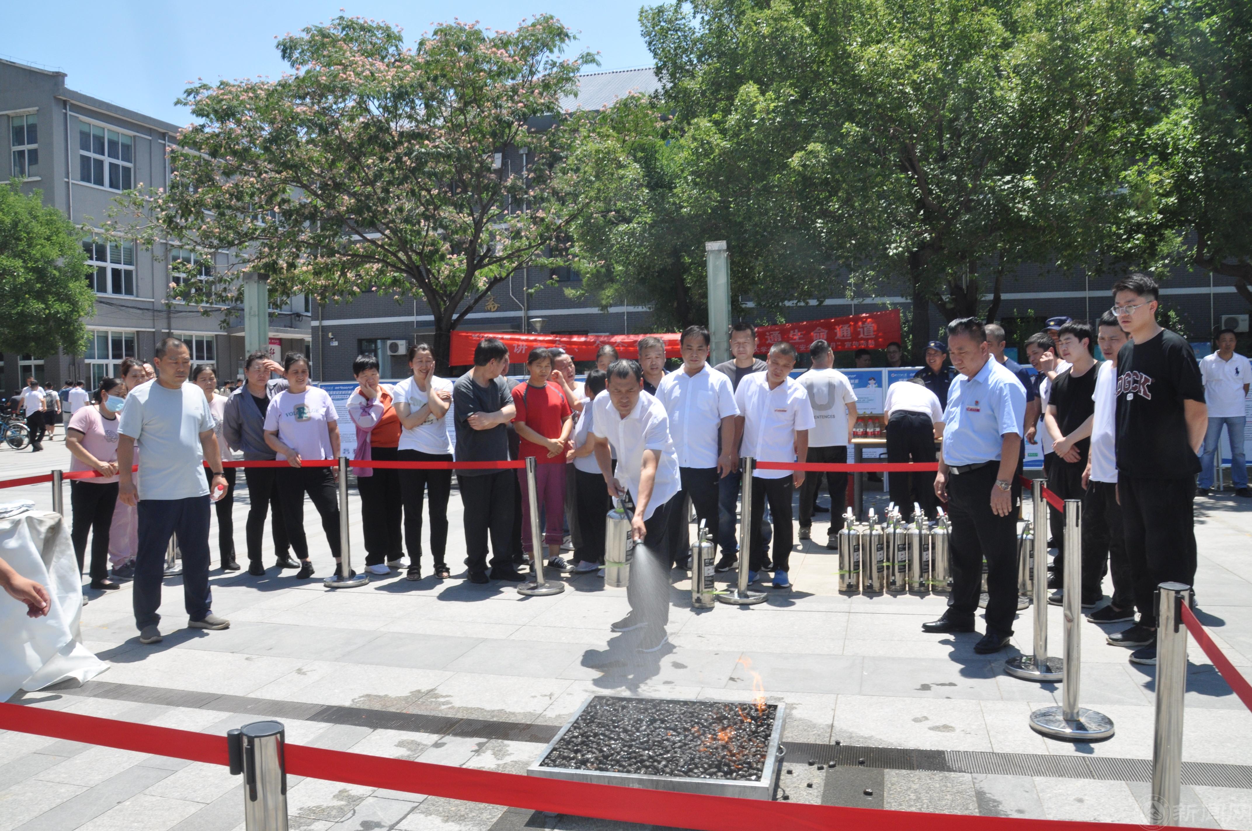 现场开展了消防演练。安稳处老师对在场的师生和员工进行了灭火器使用要点的讲解。要求操作者距离着火点2米远,拔掉安全销,喷嘴对准火苗根部按下把手,扫射火源直至火完全熄灭。随后,大家踊跃参与实践操作,掌握灭火技能,提升应急能力。