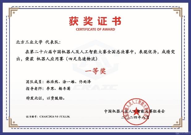 2024年8月24日至25日,第26届中国机器人及人工智能大赛总决赛在江苏省宜兴市举行。贝博官网信息学院人工智能专业学生在“四足急速物流”赛项中喜获国家级一等奖。