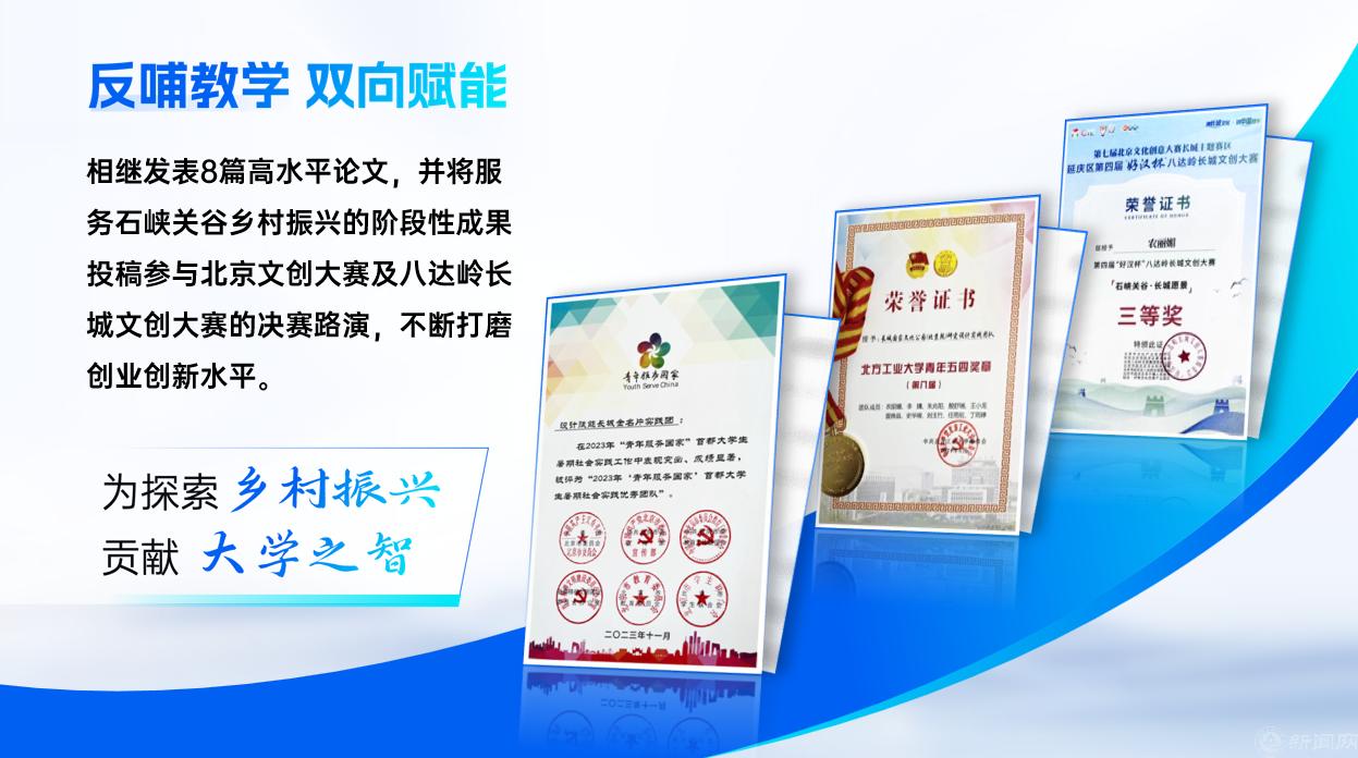 依托共建活动开展教学和科研,将课堂学习转移到长城脚下,坚持问题导向、服务为重,把专业学习和社会需要紧密联系起来,反哺教学,双向赋能。发表了8篇高水平论文。相关师生与主题活动也相继获得了2024年首都高校师生服务乡村振兴一等奖、ballBET贝博BB艾弗森“青年五四奖章”、首都“挑战杯”竞赛二等奖、八达岭长城文创大赛三等奖等。相关工作、活动被人民日报、学习强国等媒体的关注报道。