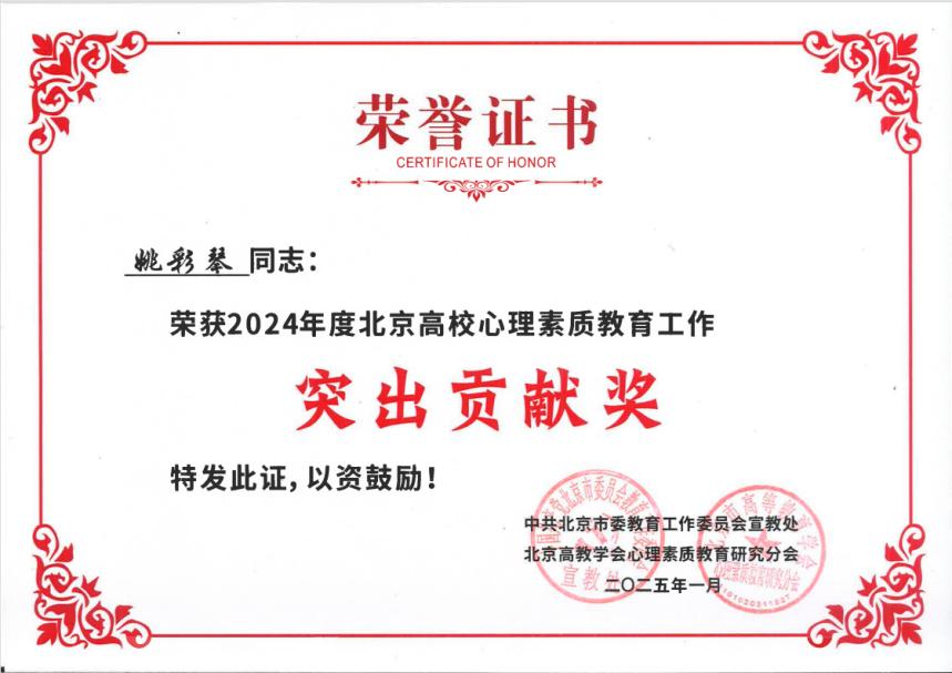 1月10日,北京市委教育工委宣教处、北京高教学会心理素质教育研究分会组织召开2024年北京高校心理健康教育工作年会。会上,贝博官网荣获集体“特色工作奖”和个人“突出贡献奖”。