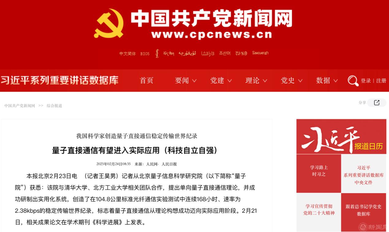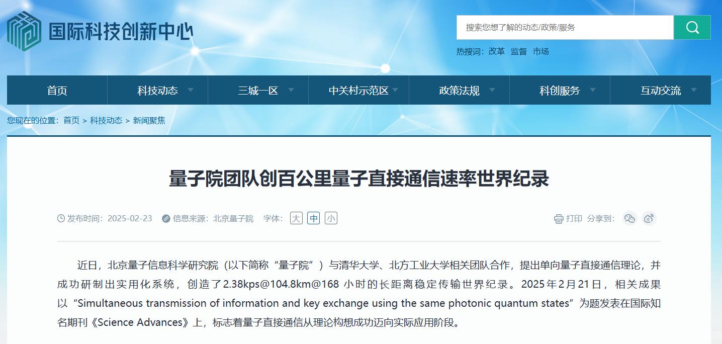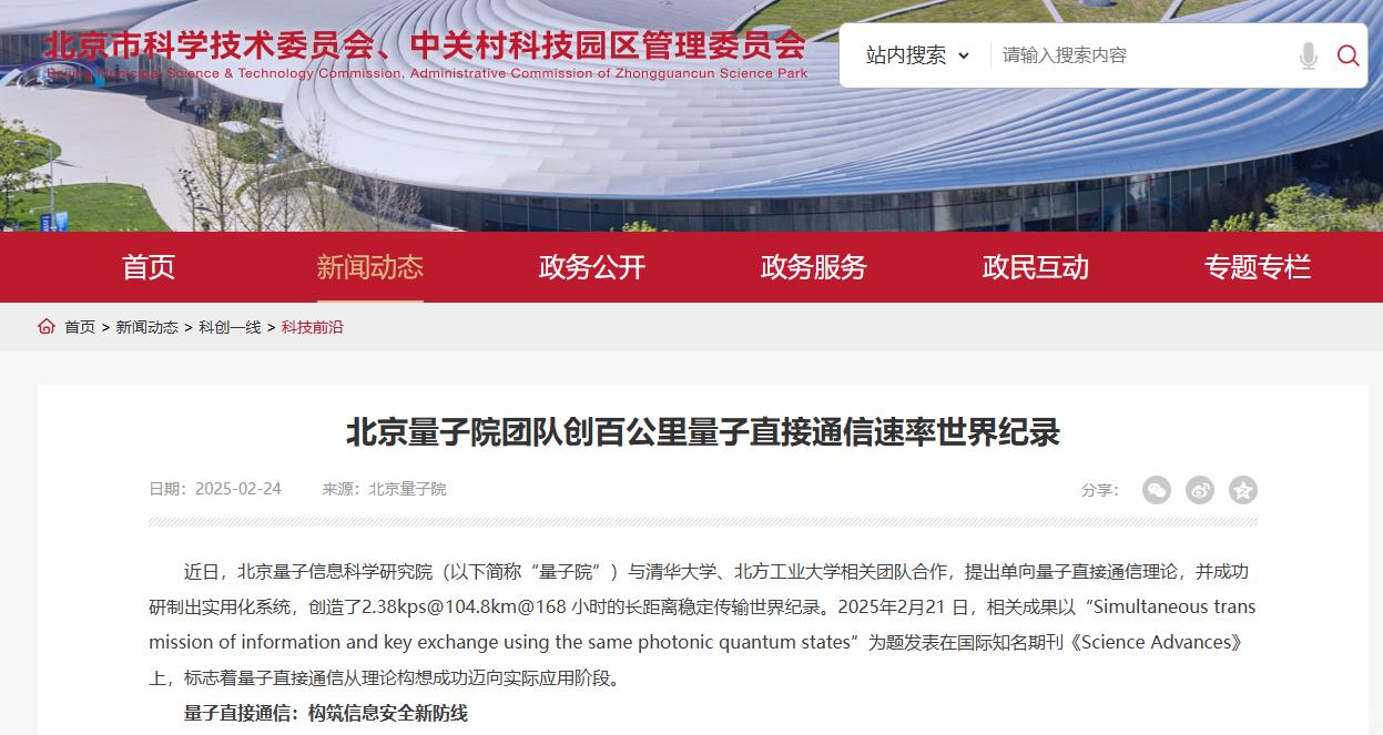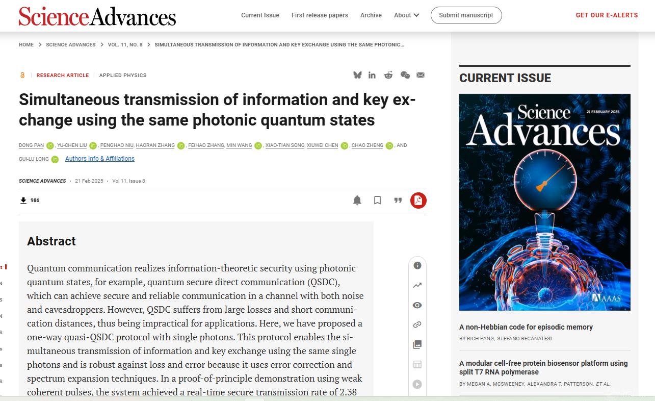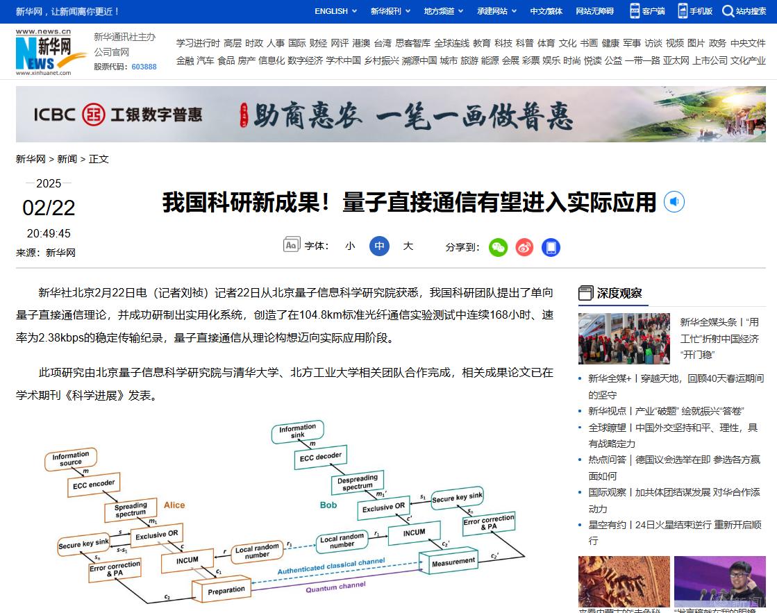 近日,贝博官网储能学院郑超教授领衔的储能量子直接通信与计算团队作为参研单位,与北京量子信息科学研究院和清华大学相关团队合作,提出单向量子直接通信理论,成功研制出实用化系统,创造了在104.8公里标准光纤通信实验测试中连续168小时、速率为2.38kbps的稳定传输世界纪录。相关成果于2025年2月21日在国际知名学术期刊《Science Advances》(《科学进展》)上发表,这标志着量子直接通信从理论构想成功迈向实际应用阶段。