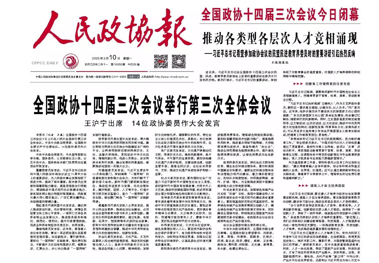 3月10日,《人民政协报》专题报道政协委员们对习近平总书记参加民盟民进教育界委员联组会重要讲话的热烈反响情况。李全明在该报道中表示,我将始终牢记习近平总书记的殷殷嘱托,努力做好德育工作。中国式现代化对人才供给质量提出了更高要求,高校作为育人主阵地,亟须以“五育”并举为抓手,将思想政治教育贯穿于智育、体育、美育、劳动教育全过程,在课程体系中将党的创新理论与专业教育深度融合,使人才既具备专业技能又厚植家国情怀。