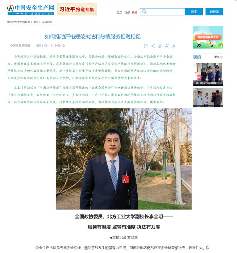 在接受《中国应急管理报》视频采访时,李全明就“严格执法,就不算为企业服务了?”这一热点话题进行回应。提出执法人员要转变思路,从替企业查隐患,转变为督促企业落实主体责任,形成企业自查自纠自改的闭环能力;要通过信息化技术,提高执法效率;要处理好严格执法和热情服务之间的关系,在重大安全隐患监督管理中要敢于“亮剑”,同时要加强技术支撑服务,提升企业安全生产保障能力。